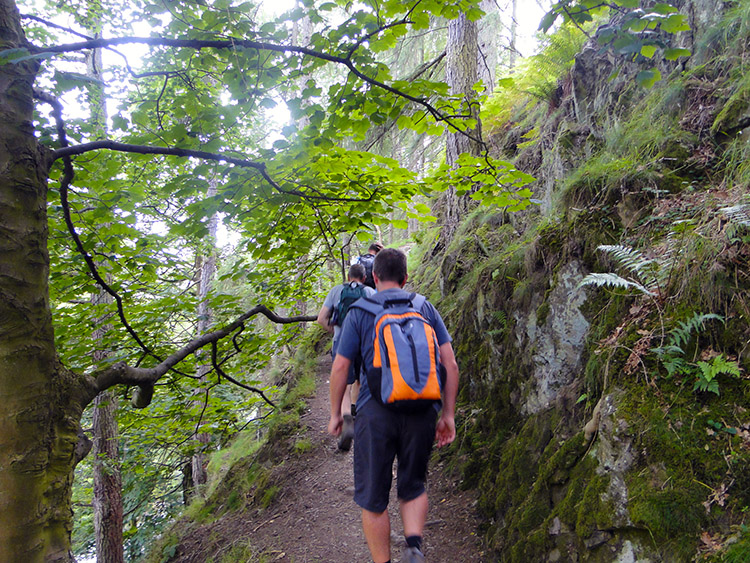 The superb path between the beck and Wren CragAfter the collection of old quarries and debris we reached the B5322 road and followed it south for 400 metres until we crossed a packhorse bridge near Bramm Crag which took us to the west side of St John's Beck. From here we followed the beck south to Sosgill Bridge and then Low Bridge End arm where we had a very comical encounter with a curious turkey. It was a new one on us all as the turkey acted more like a pet and began following us as we walked through the farm grounds. Throughout the journey from the packhorse bridge I had also been draw to the impressive face of Castle Rock on the face of Watsons Dodd and to Wren Crag which were walking towards. As wee neared the eastern edge of Wren Crag the path forced us up from the beck side to 20-30 metres higher. It was a superb path with a sheer rock face to our right and a sharp drop through trees to the beck to our left. Not a section to lose grip and fall down but a wonderful passage and a final high before we emerged out of the woodland to the roadside of the busy A591 Ambleside to Keswick road which we had to follow on a decent verge for 600 metres until we finally crossed the B5322 at Legburthwaite. Despite the final 600m trudge on the road we were well satisfied on a fantastic days walking of just over ten miles which featured a steep climbing start, a bound over rolling grassy fells, a meeting with paragliders, sublime views of the mountains - particularly Blencathra and Skiddaw, a detoured descent from the tops, a history walk through disused quarries and old equipment, a beck side stroll, a mad turkey and a great woodland ending. Brilliant.