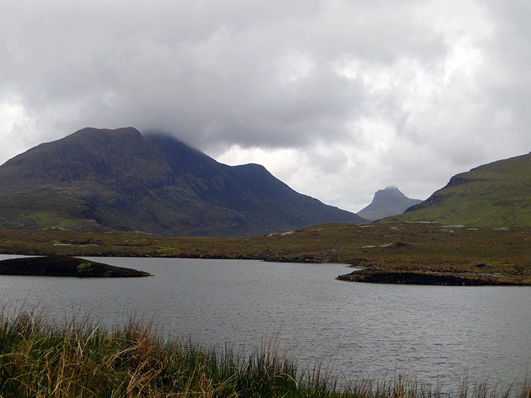 Suilven as seen from Doire DhuibhI rounded Cul Beag from the north side to the east side on a good track now clearly visible from Doire Dhuibh and a level height of 150 metres which provided more thrilling views. On the track now going south between Cul Beag and Stac Pollaidh on a slight ascent I considered my option plan to climb higher onto Stac Pollaidh. The earlier foreboding skies made my decision for me. The clouds were dropping lower quickly and it was starting to rain. Fortunately before the weather had time to close in completely I got a great view of my favourite north west Scotland mountain. By looking due north Suilven stood out from the retreating mass of Cul Mor which had shielded it from my view during my walk through the valley. Despite the deteriorating weather I stood looking for a good minute or two; it has that effect on me. The lower east slopes of Suilven were obscured by the western edge of An Laogh but it did not take anything away from my moment. At the same time Cul Beag was near to the east, Stac Pollaidh near to the west and then there was the massive of Ben More to the south directly across Loch Lurgainn. Four magnificent mountains on all four cardinal points. It was a WOW moment. During my awesome moments transfixed and somewhat pole-axed by the view the rain had set in properly so regrettably I deemed it necessary to be on my way.