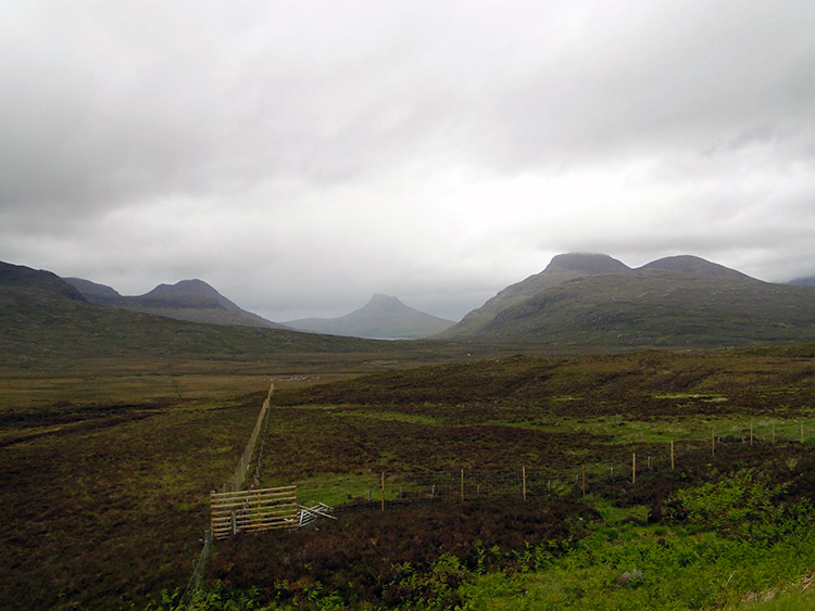 CoigaghI set off in a hurry, wanting to make good time so I could have my anticipated Saturday afternoon to myself. A little time in Ullapool collecting provisions followed by an afternoon of sport in front of my hotel room TV seemed a good idea and I aimed for it. It was not too long before I came to my first target on the map, a point by the road near the shore of Loch Cul Dromannan. Just beyond the loch the map showed a parking area and a viewpoint. I could tell why for I was looking over the loch to the Ben More Coigagh Nature Reserve. Craggy mountains and high hills were constantly in eyesight, all a result of ancient glaciation and weathered erosion and such an awe inspiring sight. I stood for a while at the viewpoint looking to Stac Pollaidh. Next time I come here I will climb it. For now I turned, walked on and further distanced myself.