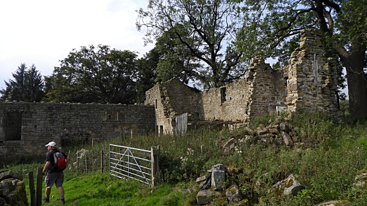The ruins of RuscoeOnce over the wall we crossed another small paddock field to reach a gate. Here the route was clearly set as a message attached to the gate read 'PUBLIC FOOTPATH. Through gate immediately to RIGHT of house gable end NYCC'. Plain enough. Keeping the line Ronnie and I walked past the buildings of Intake Farm. It seemed eerily quiet at the farm but it was clearly a working one with a big aluminum barn and huge metal silo. Vehicles were there too with a couple of stock carriers open at the back. Sheep in or sheep out? Don't know, everyone on the farm must have been indoors having their lunch. It was twelve fifteen, just afternoon. A field crossing later we arrived at what was once another farm with substantial buildings. But this one was clearly unworked. Ruscoe is a farm in ruins. Whatever happened to the farm is unclear but it seems to have been abandoned for some decades now. The main house has mostly collapsed but an adjoining barn with a lovely arch is still standing. Though all roofing is gone. From all buildings. I am surprised it has not been scavenged more for the dressed stone on the remaining structure. There was a paddock orchard and more barns. It was a crying shame to see such a desperate sight.