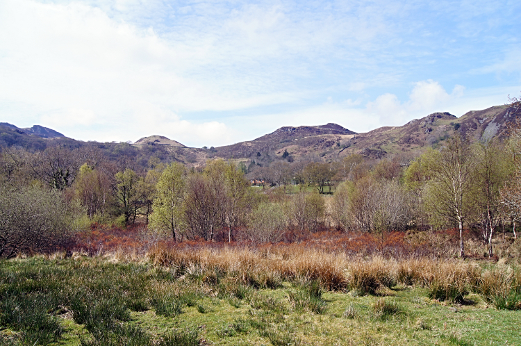 Fields and views at Maes AngharadWhen camping I find I usually wake up to the larks. Or the first bird which begins the morning chorus. Being the first week of May this was quite early on but I was not bothered. I had retired to the tent on sun down and slept well. It was around five in the morning when I pulled down the tent door zip and looked out to the world. From my cover I could still see out to the south and to the mass of Cadair Idris I would climb later on. No hurry now, I was not meeting Adam for three hours so i chilled, looking and listening to the morning break. One bird after another entertained me. Blackbird, Chaffinch, Blue Tit, Sparrow. They were all about. And a few others I could not recognise. Around seven o'clock I made breakfast and by eight camp was stowed away. I headed down from near Figra Bridge above Bontddu to make my rendezvous. Ambling down to the village I then ambled by the side of the A496 up the Mawddach valley to Pont Borthwnog and then across Penmaenpool Bridge where Adam was waiting. Once reunited, having parted company a few days earlier in Beddgelert, we set off from beside Afon Mawddach. Oh, before we go I must remind myself of Adam's gracious act. He insisted we switch backpack's. I was happy with that, not carrying my heavy home up Cadair Idris suited me. And Adam is a big fit lad. We would be fine. Back to the walk, up from Penmaenpool we went, immediately climbing southwards through woodland and then across some fields to Maes Angharad. From there the path pointed across more fields in a south-east direction to Graig. Most of the fields were untended, patches of grass and clumps of scrub with bogs and some no more that copses and thickets. However we tried, and there were two of us, we did lose the path a few times on what appeared to an easy straight line course. Once we did have to turn back from a field to where we entered it and start again. Fun and frustration at the same time but we made it to Graig. Not by the straightest course though.