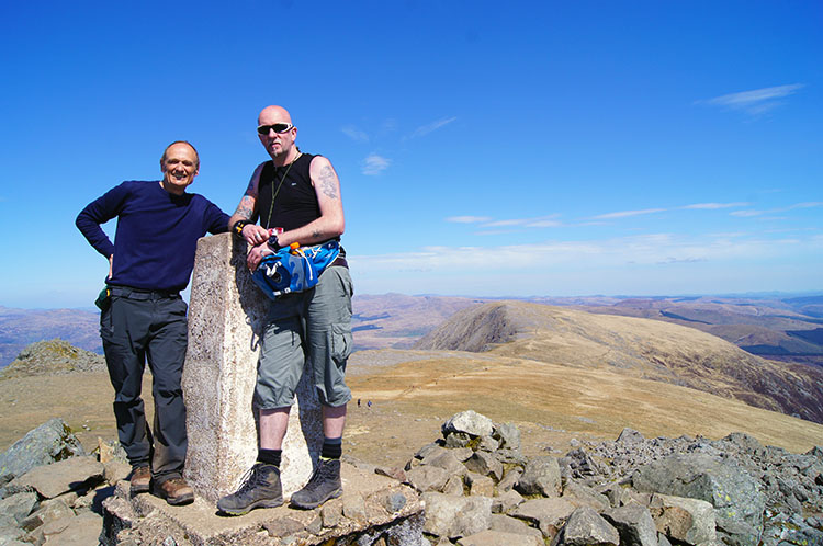 Walking Englishman and Adam Gallimore on Cadair IdrisFrom 100 meters to go the walk gets steeper again with the last few hundred meters a path up a rocky slope. Just the type of completeness you need on a magnificent mountain such as Cadair Idris. I spotted the trig point on the summit for the first time but before we could complete our ascent we were obliged to stop and talk with a group of four people, two couples from Shropshire who we had met briefly at Ty-nant. Then it happened, one of the ladies said "It's you is not it, the Walking Englishman?". "Yes it is" I replied and I immediately added "and did you know I am in the company of that illustrious walker the Great Gallymo". The conversation continued for some time. I told them of my Welsh Coast to Coast walk and I mentioned my distances per day pale into insignificance when you compare them to the challenges Adam takes on, some over 50 miles in 24 hours. That led to another conversation about the Longmynd Hike which they and Adam regularly complete. Refreshed from the conversation we bounded up to the summit and celebrated our arrival at the top. (Note: later on, through Facebook one of the Shropshire group posted: Hello, it was lovely to meet you and Adam today on Cadair Idris. We hope the rest of your Wales Coast to Coast goes well and we'll be following your progress. From the Famous Five from Shropshire. — Lynn Turner and Liz Hill.) Thanks for that. After the obligatory photographs which were taken by a very fit lady fell runner Adam and I descended from the craggy summit and laid down on the flat ground to take lunch. And what a place to take lunch; on this spectacular day the views were sublime.