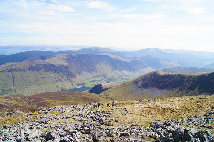 Llyn y Gadair sits in a natural amphitheaterAfter lunch we descended first by the way we came and then by a steep rocky path to Craig Cau. at the bottom of the dip between Penygadair and Craig Cau we came across another group of walkers, five this time, two men and three ladies from Stockport. One of the ladies said "Can you tell me what the blazes I am doing up this mountain?" She was not a happy person at that moment. I said to her "Because of the sense of achievement you will feel at the top. And the views you will have in front of you. Keep going you are nearly there" Then she went on with her colleagues and I bet she enjoyed the feeling of euphoria at the top. Adam and I continued on climbing to the top of Craig Cau. As we did we got great views of Llyn y Gadair and the steep path weaving up the mountain from it. "Bet you're glad you did not do that now Bud?" asked Adam. "You bet" I replied.