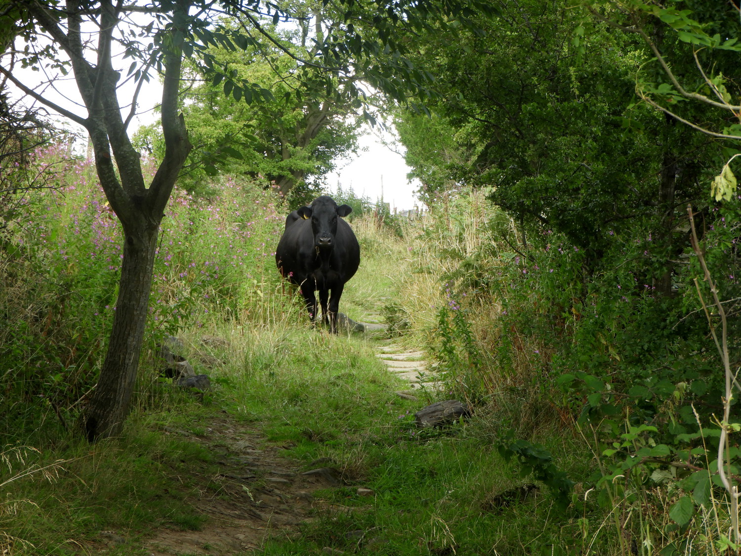The Confused Cow IncidentBeyond Birch Close Farm my next objective was the scattered hamlet of Little London, which is more a series of converted farm buildings than an established community. Very remote it is, a long walk to the nearest shop for milk and the morning newspapers. And most likely the ideal situation for those living the quiet life out here. Beyond Little London I walked the path on a narrow walled lane with fields on either side. These fields, just prior to reaching Old Wood Farm, were cow pastures. The bovine inhabitants of either field were settled and those nearest the wall looked over at me as I walked along with some interest. Then I discovered their peculiar attention as one of their group, from one of the fields left or right, I didn't know, had somehow got out of its field and stuck on the path. She saw me coming and having nowhere to go she turned tail and walked away, ahead of me, down the lane. Eventually she reached a point where she could go no further, gate ahead of her, gate to her left, gate to her right. I tried to calm her, edging to one gate and making my way to open it when she decided she could wait no more and therefore to bolt. She ran to the gate on the right hand side and leapt over it, bending the top bar of the gate as she hurdled over! WOW. I had always wondered how some farm gates got bent on the top. Now I knew.