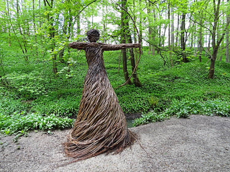 Spirit of the Medieval HuntressAfter following the access path and after crossing a footbridge over Eller Beck to reach and pass the buildings of the old sawmill we arrived at the woodland via the appropriately named 'Sawmills Entrance'. Once in the woodland we read an information board telling us what we could do and expect on the walk. For example we could undertake the Sougha Gill Challenge, a fifty step climb from the valley floor. Which Lil partly did. And we could hope to see many bird species including Heron, Kingfisher, Wren, Dipper and Wagtail. Seeing those five lovely species was a nice thought. Also, we could play nature detectives by collecting catkins, pine cones, twigs, feathers and leaves to make into art when home. If only we had the grandkids with us. The walk in the beauty of the woodland was enough for us which started by walking by an impressive wood art feature, a figure of a lady archer, fashioned from willow. It is called 'Spirit of the Medieval Huntress' and created by the very talented local artist Anna Cross, the Willow Weaver.