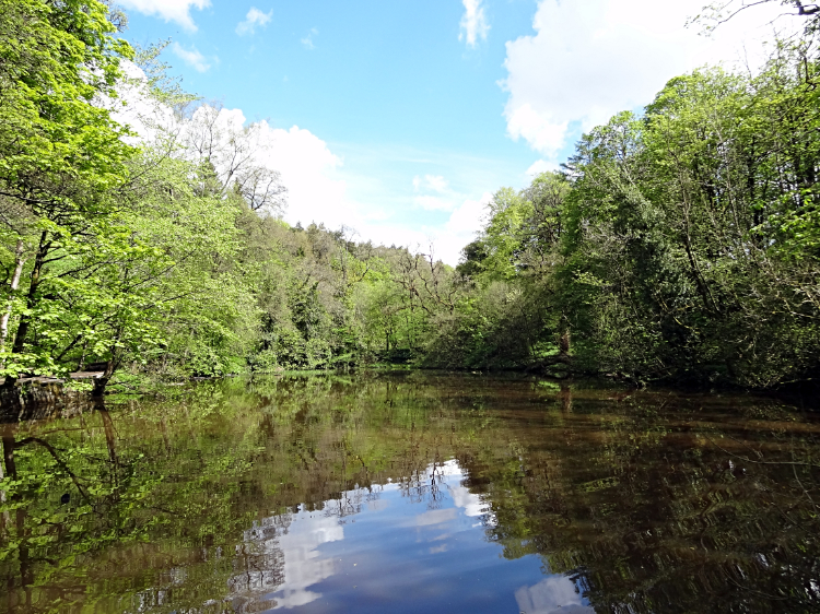Round Dam section of Eller BeckNear the athletic Sougha Gill steps and adjacent to Round Dam Lake we found a weir in Eller Beck which is the controlling leveller of Round Dam, the stretch of Eller Beck we were now approaching. Another information board confirmed this stating "Eller Beck weir: At the end of Long Dam Eller Beck cascades over the weir where it is joined by water from Sougha Gill, a craggy limestone stream". The information board also showed the old redundant mills we had passed on the way, including High Corn Mill near the start at Mill Bridge which is now shops and business units and High Mill which was located near the Old Saw Mill. Information banked, we carried on with our walk, following Round Dam to the far north-east end of the woods. Towards the end the calm tamed Long Dam reverted to untamed Eller Beck, waters now gushing and tumbling over rocks. We noticed we were also climbing slightly. Before we left the back side though I chatted with two men floating an odd looking boat in the beck, a boat tethered to ropes held by each chap, one on each bank. "Odd looking boat, what are you up to" I asked. "Measuring water flow. It is a flow meter utility" replied the chap nearest to me.