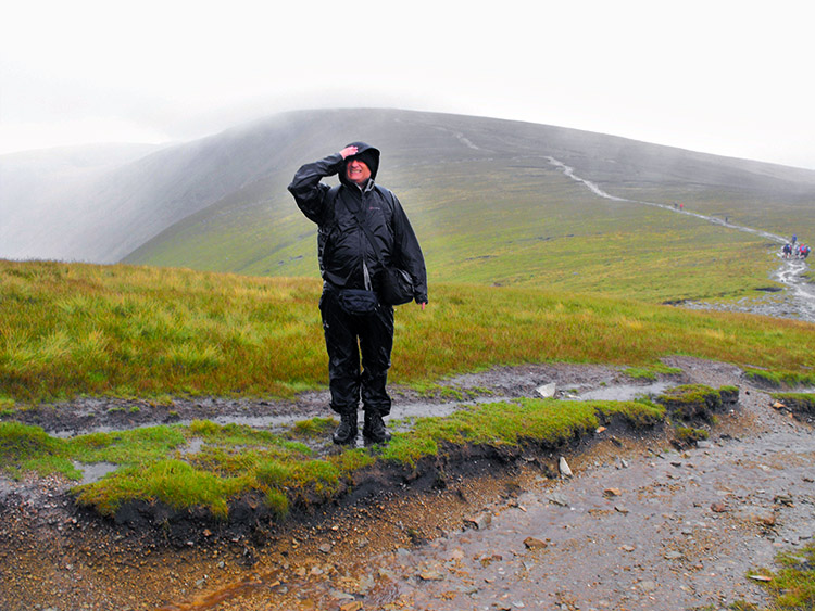 Drenched at the Beacon on Thornthwaite CragAs we left our brief encounter with the Coast to Coast path and walked over the Straits of Riggindale to High Street we entered into the descending cloud and by the time we reached the northern end of High Street it was raining. The next two and a half kilometres of the walk along High Street, past Racecourse Hill and to the beacon at Thornthwaite Crag were hellish. The rain became heavy very quickly and as is on high ground hit us like darts. It was driving into us horizontally so much that we had to look down to the ground to avoid the wet missiles. At the outset we had quickly donned our full waterproof gear which protected us as best it could but we still were soaked through. Suffice to say we did not enjoy the views from High Street and so missed out on Wainwrights description of our walk which says "Proceed from the Straits of Riggindale to the summit...by following the edge of the eastern face (which has excellent views) until the Ordnance Survey column comes into sight". We followed his path precisely but we did not see any of the promised views. The cloud put paid to that. Still, in such adversity, people find humour in it and as we passed walkers in the same distress comments abounded like "lovely day", "great to be out walking" and "what a delight to be up here in such splendid weather". This type of day rounds off the experience and by the time we reached the huge beacon and nearby wall which offered us some protection we could not stop laughing about it.