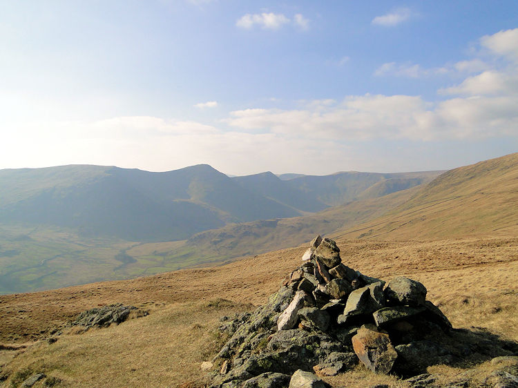 Looking from Frostwick to Thornthwaite CragHaving completed the descent from Ill Bell I undertook the short ascent to Frostwick which is almost identical in shape to Ill Bell, albeit a junior version and 37 metres lower. A little behind my schedule I paid the summit of Frostwick a cursory respect before continuing on to the famous broad sweeping ridge of High Street, once a Roman Road and once a racecourse! I was in fact bridging the west and eastern ridges of Kentmere by walking on the southern flank of Racecourse Hill, aptly named because earlier Lakelanders used to make the journey up onto the heights to race horses as part of summer fairs held on High Street during the 18th and 19th centuries. There are no fairs held on High Street now but should there still be then today would have been perfect, calm with no wind and set fair. Not at all like my two previous excursions on High Street, both events being in rain with low cloud and no visibility. This time I could see High Street in all its natural beauty, a high wide plateau perfect for strolling at height.