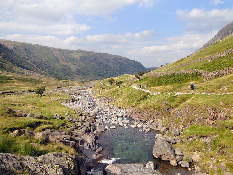 Seathwaite comes into into viewEnjoyment abounded from Sprinkling Tarn, first by a walk down to Sty Head and then past the west edge of Styhead Tarn to follow Styhead Gill to Patterson's Fold and then gently down to Greenhow Knott. It was a pleasure walking this way for I have seldom done it, more often walking up the track from Seathwaite toward Styhead Tarn and the Corridor Route to the Scafell range. The aspect of Seathwaite as it appeared as we approached Greenhow Knott was quite different to my usual course down Grains Gill. This way, the work we had done in climbing the steep path to Glaramara earlier in the day was clear to see making it more dramatic and thus better appreciated.