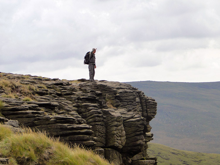 A fine view pointAs we drew nearer to Kinder Scout we were enticed upwards by the gritstone outcrop of cliff looking out westward which form the north west extremity of the Kinder Scout formation. The feature is not named on maps but it should be, such an impressive sight it is. We scampered up to reach the top of it, a crumple of gritstone which resembled layers of melted chocolate ran over one another to form multiple layers. Steve stood on top of the cliff and looked back to from where we had walked earlier in the day.