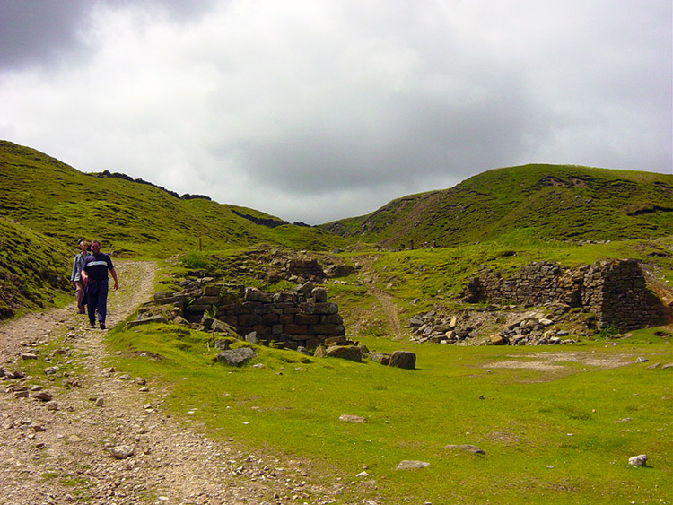 Cock Hill Mine WorkingsGalloway Pasture led us to the highest point of the walk near Greenhow Hill Top. There was a shock for me waiting in the deep grasses of the pasture. I was walking serenely on just ahead of Dave and Stewart when all of a sudden there were screeches and a Grouse leapt up in front of my eyes. Almost immediately there were more flutters in all directions as young grouse scampered off in all directions. I stood still until all calmed and only after a time did I attempt another step. Then as I put my foot down another young grouse ran off alarmingly. I must have been on or very near a nest. I was so relieved I had not trod on one but by the sound of their alarm I must have come pretty close to doing so. Dave and Stewart arrived on the scene wondering what had gone on. They were slightly amused as it always seems to happen to me. After composing myself we made our way over the pasture past a host of old mine shafts and crossed the B6265 for the second time and made our way onto Cock Hill. This led us down to the disused workings of Cock Hill Lead Mine. The mine had huge reserves of lead ore and was one of the most important mines in the area in the early 1900's. The mining area is stark and eerie now but once home to washing and crushing facilities, Blacksmith's workshops and smelting works. The dereliction is a poignant and humbling reminder of the past working conditions that people endured to provide us with the essential resources needed to build this country. I read the two information boards on the site and while doing so I thought about the severity of the conditions in which the miners worked. It was a lovely summers day today and the sun was out. I have often worked in this area in awful conditions during my days with Yorkshire Water. All I had to do was to locate burst water mains and organise their repair before restoring the water supply. That was tough work when it was stormy as it often is up on the moor and I did not have to go underground. The miners of Cock Hill all deserve our utmost respect. They certainly have mine.