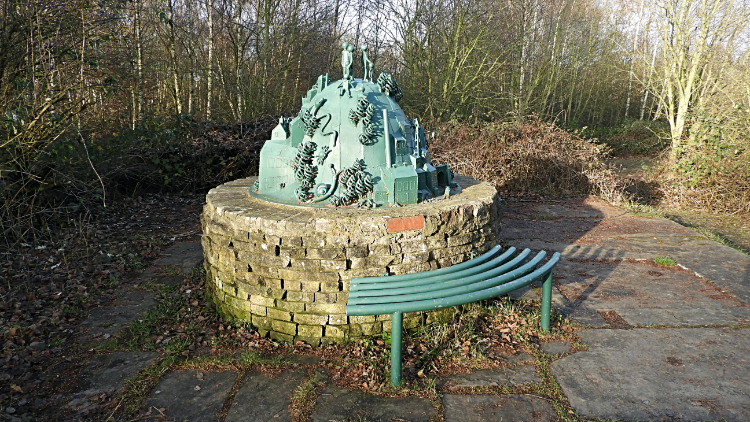 The enigma sculptureAround the corner from the lady with big lips was a stone circle set amidst more young trees and then a little further on we found another lady with lets say 'nowt much'. Lil joined her for a photo shot. Then a little further on we came to another sculpture which defied any thought from us as to what it was. Domed with buildings set into the sides and figures of people set besides and on top of the dome. Perhaps it represented the industry and community of the colliery which once stood here.