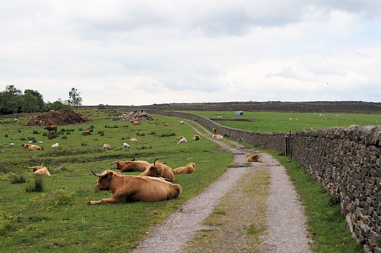 Very friendly youngsterThe three great days of weather on our long weekend in the Peak District did not extend to the final day. It was not raining but it was an extremely dull day we woke up to, all due to a weak low pressure system drifting south. Despite the depression in the air there was no stopping us, we had a final short spectacular walk to enjoy along a long gritstone edge. As we were subject to a time restriction the walk was a linear one so we deposited my car at the finish in a car park on the edge near Nether Padley and drove to our start four miles away in Steve's car. It had been an eventful day before the start of the walk. We all went out last night in Buxton and enjoyed a few pints before finishing off with a delicious curry. Then in the night rumblings occurred in our digs. Joe and I had a peaceful night in our room but next door there had been sinister goings on. Steve first got up at around 5.00am and went a walking. He was to do four further times before breakfast. Meanwhile Dave had woke up in the night in a feverish sweat, all soaked through. A nightmare had interrupted his well earned slumber and probably caused by Steve's somnambulism. It must have been a restless room that night. The interruptions had not dampened their spirits for the walk though and we set off on a track towards Baslow Edge for a meeting with Wellington's Monument and the Eagle Stone. Immediately we came across a hers of Highland cattle. They were extremely benign despite the mothers having very young calves with them. It was a friendly encounter.