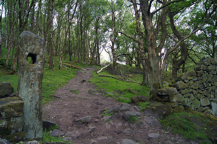 Woodland sheltered by Curbar EdgeAfter a little more fun on the top side of Curbar Edge I reached the point where I had to leave and make my way down below the gritstone line to the woodland below. As if by magic as I left the top line of the scarp the sun returned to the scene and warmed the day. My finale through the wood was enjoyed with the additional brightness of dappled light piercing the woodland and highlighting the path in front of me. I looked up through the mass of trees when possible to spy the gritstone being bathed in sunlight once more. As earlier, it was a gorgeous sight.