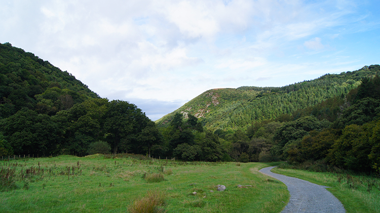 The path leading into the plantationAfter five minutes of walking on the narrow unmade path I crossed the river by a footbridge and started my walk along the hard track which is suitable for all. Everything from wheelchair to bus could negotiate this bit of the walk and I bet they do. I did meet a couple pushing their infant child to see the waterfall which I was pleased about. I did not see any bus though which I was also pleased about. The narrow valley I had driven up from Abergwyngregyn to Bont Newydd and which I had walked on the narrow unmade path was much wider now and as a consequence wider views were unveiled. After a dull morning sun was breaking through in some places. It highlighted Moel Wnion by shining on it like a spot lamp.